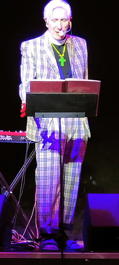 I like stairways. This one was in my hotel. The staff here were terrific, really. On to Liverpool. Deaf School bassist and all around fantastic guy Steve Lindsey ("Mr. Average") invited me to bandmate John Wood's (aka The Reverand Max Ripple) little caberet show at Liverpool's historic Cunard Building (one of the waterfront's "Three Graces") the night before the big do, and so I greatly enjoyed an evening of humor, music, good cheer, and spiritual guidance! John has been deploying his alter ego since the earliest days, and I told him afterwards that he seemed as dedicated to his character as was Barry Humphries to Dame Edna. That really thrilled him, and so that made me happy. The Reverend Max Ripple, orating: