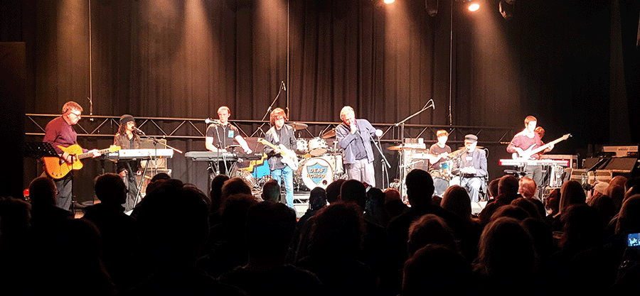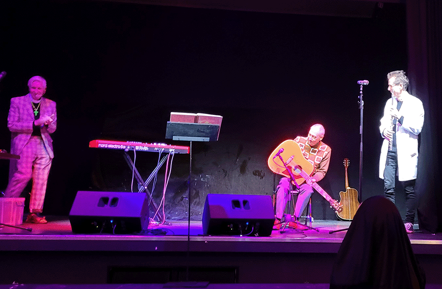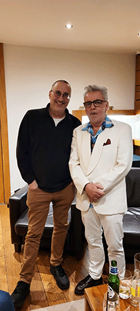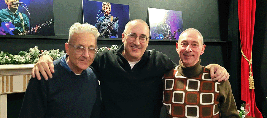 And another: And here's a clip of their lowkey version of Deaf School's Room Service, perhaps my favorite DS song. DS's Steve Allen (Enrico Cadillac, Jr.) came up on stage for a vocal turn. Room Service Actually, before the show, I gathered the gumption to introduce myself to Deaf School's Clive Langer ("Cliff Hanger"). Mega-star producer of Madness, Elvis Costello, Dexys Midnight Runners, and many others. He was extremely gracious, and I was thrilled and honored to meet Rock Royalty (as Gary characterized him when I told him about it later). Here're Clive, me, and Steve during intermission, along will the wonderful Ken Testi mugging in the back. Ken put Queen on the map; he was buddies with Freddie from the beginning! He also opened the world famous Liverpool club Eric's, and has been a prime mover in the Deaf School camp since their inception: